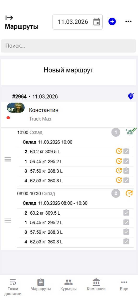 Диспетчер вносит правку в точку или заказ — система обновляет порядок посещений и расчётное время прибытия. Курьер получает обновлённый список стопов.